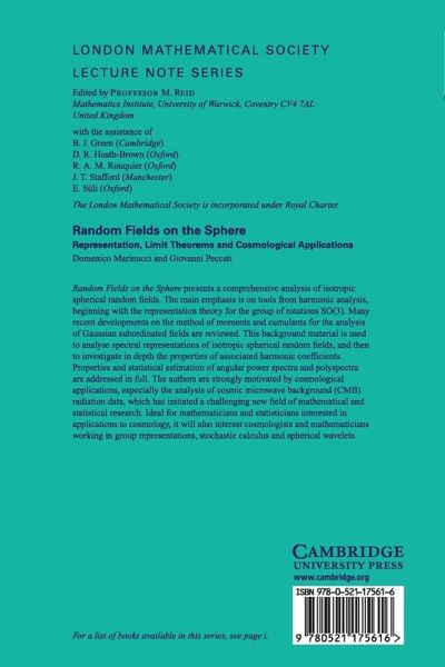 Random Fields on the Sphere presents a comprehensive analysis of isotropic spherical random fields. The main emphasis is on tools from harmonic analysis, beginning with the representation theory for the group of rotations SO(3). Many recent developments on the method of moments and cumulants for the analysis of Gaussian subordinated fields are reviewed. This background material is used to analyse spectral representations of isotropic spherical random fields and then to investigate in depth the properties of associated harmonic coefficients. Properties and statistical estimation of angular power spectra and polyspectra are addressed in full. The authors are strongly motivated by cosmological applications, especially the analysis of cosmic microwave background (CMB) radiation data, which has initiated a challenging new field of mathematical and statistical research. Ideal for mathematicians and statisticians interested in applications to cosmology, it will also interest cosmologists and mathematicians working in group representations, stochastic calculus and spherical wavelets. The authors present a comprehensive analysis of isotropic spherical random fields, with a view towards applications in cosmology. Any mathematician or statistician interested in these applications, especially the booming area of cosmic microwave background (CMB) radiation data analysis, will find the mathematical foundation they need in this book.