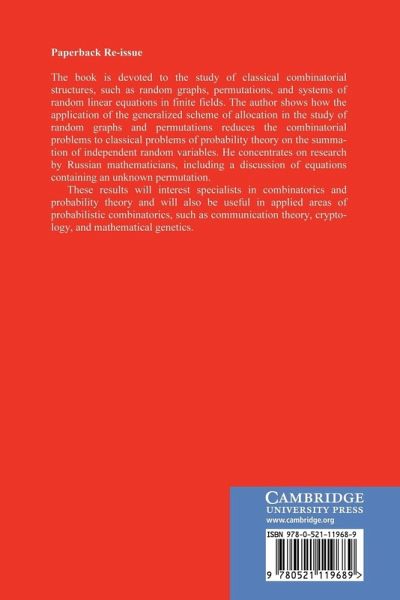 This book is devoted to the study of classical combinatorial structures such as random graphs, permutations, and systems of random linear equations in finite fields. The author shows how the application of the generalized scheme of allocation in the study of random graphs and permutations reduces the combinatorial problems to classical problems of probability theory on the summation of independent random variables. He concentrates on research by Russian mathematicians, including a discussion of equations containing an unknown permutation and a presentation of techniques for solving systems of random linear equations in finite fields. These results will interest specialists in combinatorics and probability theory and will also be useful in applied areas of probabilistic combinatorics such as communication theory, cryptology, and mathematical genetics.