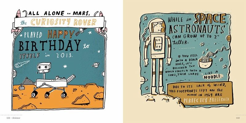 Did you know that Napoleon was once attacked by rabbits? Or that the Mars Rover sang itself “Happy Birthday”? How about the odd ingredient Civil War soldiers used to make coffee? Trivia meets its match. From Jupiter’s diamond showers to why pirates wore eye patches to the delightful link between dancing goats and the discovery of coffee, this collection of obscure and fascinating facts is brought to you by Mike Lowery, an illustrator and connoisseur of the offbeat. Featuring four gatefolds and hundreds of infographic webs that connect the trivia in dozens of surprising ways, it’s a little book that delivers endless delight.