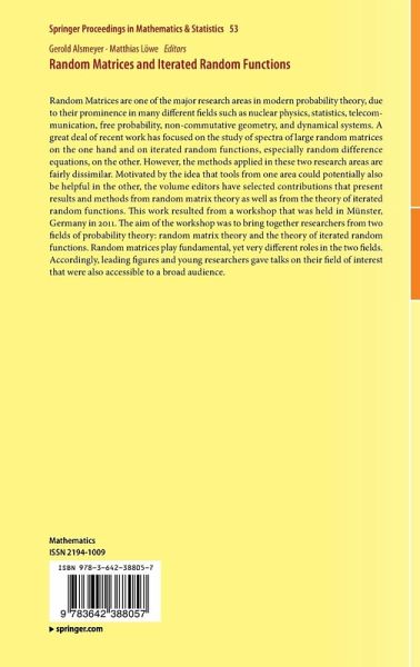Random Matrices are one of the major research areas in modern probability theory, due to their prominence in many different fields such as nuclear physics, statistics, telecommunication, free probability, non-commutative geometry, and dynamical systems. A great deal of recent work has focused on the study of spectra of large random matrices on the one hand and on iterated random functions, especially random difference equations, on the other. However, the methods applied in these two research areas are fairly dissimilar. Motivated by the idea that tools from one area could potentially also be helpful in the other, the volume editors have selected contributions that present results and methods from random matrix theory as well as from the theory of iterated random functions. This work resulted from a workshop that was held in Münster, Germany in 2011. The aim of the workshop was to bring together researchers from two fields of probability theory: random matrix theory and the theory of iterated random functions. Random matrices play fundamental, yet very different roles in the two fields. Accordingly, leading figures and young researchers gave talks on their field of interest that were also accessible to a broad audience.