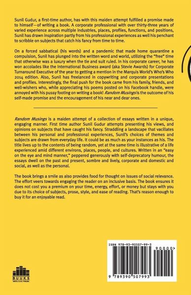 About the Author: Sunil Gudur, a first-time author, has with this maiden attempt fulfilled a promise made to himself-of writing a book. A corporate professional with over thirty-three years of varied experience across multiple industries, places, profiles, functions, and positions, Sunil has drawn inspiration partly from his professional experiences as well his penchant to scribble on subjects that catch his fancy from time to time On a forced sabbatical (his words) and a pandemic that made home quarantine a compulsion, Sunil has plunged into the written word and world, utilizing the "free" time that otherwise was a luxury when the tie and suit ruled. In his corporate career, he has won accolades like the International Business award (aka Stevie Awards) for Corporate Turnaround Executive of the year to getting a mention in the Marquis World's Who's Who 2014 edition. Also, Sunil has freelanced in copywriting and corporate presentations and profiles. Interestingly, the final push for the book came from his family, friends, and well-wishers who, while appreciating his poems posted on his Facebook handle, were annoyed with his pussy footing on writing a book! Random Musings is the outcome of his self-made promise and the encouragement of his near and dear ones. About the Book: ¿Random Musings is a maiden attempt of a collection of essays written in a unique, engaging manner. First time author Sunil Gudur attempts presenting his views, and opinions on subjects that have caught his fancy. Straddling a landscape that vacillates between his personal and professional experiences, Sunil's choices of themes and subjects are drawn from everyday life. It could be as much as your instances as his. The title lives up to the contents of being random, yet at the same time is illustrative of a life experienced amid different environs, places, people, and cultures.