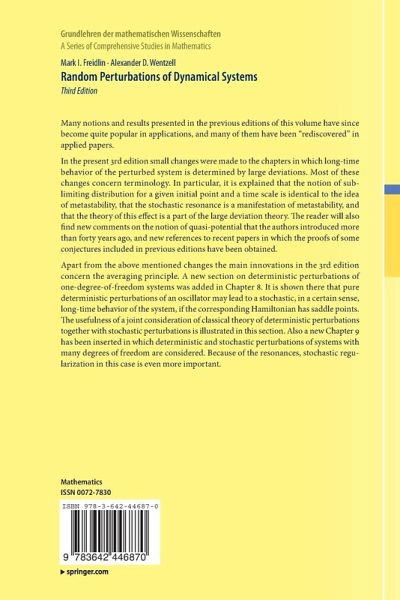 "The celebrated work of Ventsel and Freidlin has proved to be a major contribution in this development, with their phenomenal text Random Perturbations of Dynamical Systems, now in its third edition, playing a unique role. ... The book under review has evolved since its first English edition was published in 1984, a translation from the Russian original of 1979. ... it will attract an ever growing population of applied mathematicians to the fascinating new frontier of stochastic dynamics." (Hong Qian and Hao Ge, SIAM Review, Vol. 55 (3), 2013)