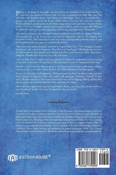 Poetry is all things to all people and this book is no exception. I am concerned that it could have the impact of a drone strike. Let your imagination run wild. Have fun. The title tells it all, "Random Runes, New Poems and Old Elegies." I built a formidable file of poems I put together during the decade (2000-2010). It has been five years since Author House published my first poetry book titled, "Songs from a Cave and Other Selected Poems (1995-1999)". So, I bought a touch screen computer and an excellent printer (hp Officejet pro 8600 jet) and went to work organizing, authorizing and deputizing. What a job. I decided to randomize the individual works using Moses and Oakford's "TABLES OF RANDOM PERMUTATIONS" left in my library from my doctoral dissertation days at UC Berkeley (14 December 1974). There must be an easier way today. Consequently personal, political and philosophical works are scattered around by the process. There were new poems along the way such as "Super Urban Man", "On Salvaging a Sunken Stanchion" and, not to forgotten, "Beat Down at Dog Beach." Old Elegies were written for old friends who have passed away, Arnold, Bob, Harry and five or six others. They rime using the villanelle style and went over very well at the time. "Give Us your Sons" is topical and international. It's about the molestation of boys serving on the altar of churches. The last line is: "We went back at seven for Mysteries of the Cross." Members of Poetry for Pleasure" at the Roger's Senior Center in Huntington Beach, CA like, as of today, "Dross Bucket" and "Baby Slobodan's First Photograph." If you are a Bicyclist you'll appreciate, "Riding Around the Bear" where I take you over Onyx Summit by Big Bear Lake and nudists will appreciate, "Danseuse Narurel" in four parts. The last sentence is: "All of you, from head to toe will be slipping, sliding, gliding then move and pose au naturel to four-four time and dance the tango." Above all, have a good time experiencing "Random Runes" and, if you like, recommend it to your friends and family. Of course, I'd appreciate it if you did. Gerald Olson