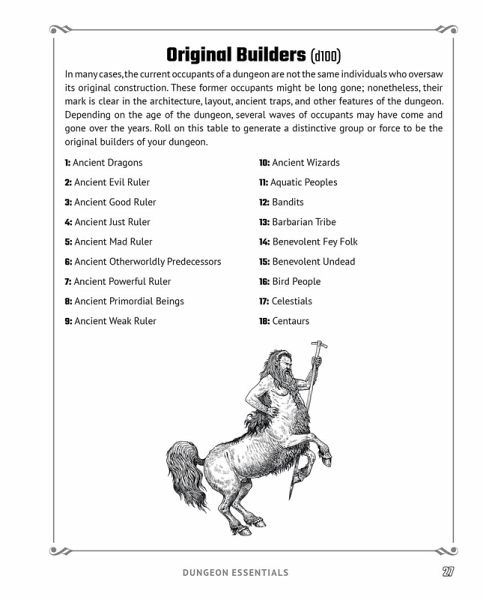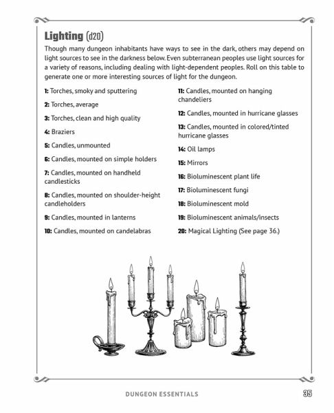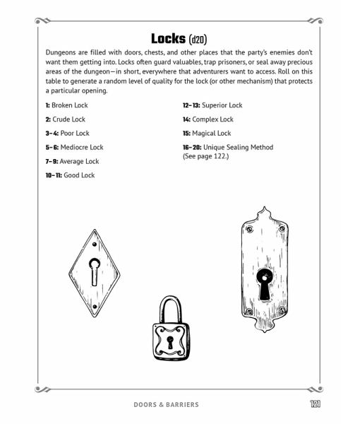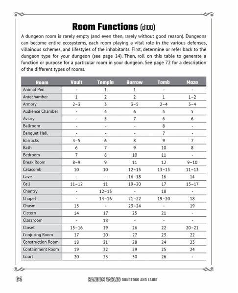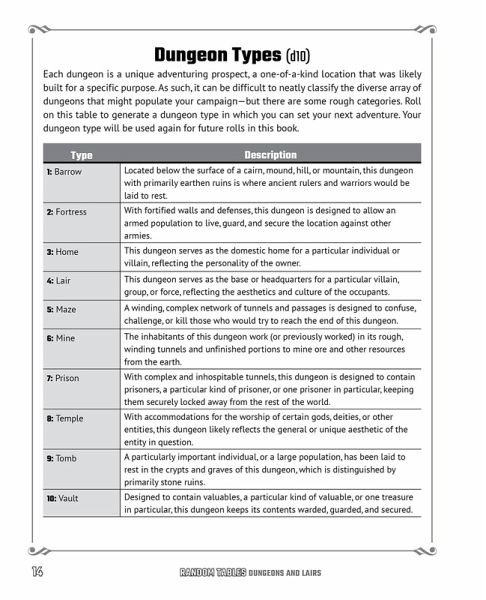 Get ready to add even more dark and dangerous detail to your table fantasy tabletop role-playing game with hundreds of random tables designed to help you create epic storylines full of mysterious dungeons, secret entrances, and more! Take your fantasy world to the next level, all with the roll of a dice! Random Tables: Dungeons and Lairs is a utility book for fans of tabletop role-playing games like Dungeons & Dragons, allowing game masters to generate on-the-fly content for their adventures traveling through dangerous dungeons, choosing room and hall aesthetics, and discovering unique sealing techniques. Adventurers love to ask tough questions that can sometimes put game masters on the spot and put their creative skills to the test. Never fear being stumped when the party asks: * What type of rumors are embedded into this dungeon? * What’s this room's feature and how can I navigate it? * Is this door made from magical properties or is it normal? Generate all of these answers and more by rolling on the dozens of randomized tables provided within these pages. Your party will love your fast-paced and exciting adventures, and even you will be on the edge of your seat to see what happens next!