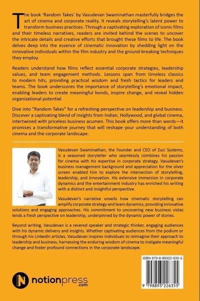 The book 'Random Takes' by Vasudevan Swaminathan masterfully bridges the art of cinema and corporate reality. It reveals storytelling's latent power to transform business practices. Through a captivating exploration of iconic films and their timeless narratives, readers are invited behind the scenes to uncover the intricate details and creative efforts that brought these films to life. The book delves deep into the essence of cinematic innovation by shedding light on the innovative individuals within the film industry and the ground-breaking techniques they employ. Readers understand how films reflect essential corporate strategies, leadership values, and team engagement methods. Lessons span from timeless classics to modern hits, providing practical wisdom and fresh tactics for leaders and teams. The book underscores the importance of storytelling's emotional impact, enabling leaders to create meaningful bonds, inspire change, and reveal hiddenorganizational potential. Dive into "Random Takes" for a refreshing perspective on leadership and business. Discover a captivating blend of insights from Indian, Hollywood, and global cinema, intertwined with priceless business acumen. This book offers more than words-it promises a transformative journey that will reshape your understanding of both cinema and the corporate landscape.