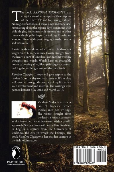 The book RANDOM THOUGHTS is a compilation of write-ups, on those aspects of life I have felt and feel strongly about. Nostalgic reflections as I move down memory lane, reminiscing about the bygone days, sometimes with childish glee, sometimes with remorse and at other times with a hopeful hope. The writings likewise are a smooth blend of the past merging into the present and vice-versa. I write with candour, which most oft than not verges on to bluntness since I write straight from the heart, a sort of umbilical connect betwixt my thoughts and words. Words have an intangible power of coming alive, like a painting on a canvas, making the reader get lost amidst their folds. Random Thoughts I hope will give respite to the readers from the day-to-day stresses of life as they will traverse through the journey of my life with a keen involvement and interest. The writings were penned betwixt May 2012 and March 2014. Thank you.