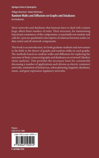 Most networks and databases that humans have to deal with contain large, albeit finite number of units. Their structure, for maintaining functional consistency of the components, is essentially not random and calls for a precise quantitative description of relations between nodes (or data units) and all network components. This book is an introduction, for both graduate students and newcomers to the field, to the theory of graphs and random walks on such graphs. The methods based on random walks and diffusions for exploring the structure of finite connected graphs and databases are reviewed (Markov chain analysis). This provides the necessary basis for consistently discussing a number of applications such diverse as electric resistance networks, estimation of land prices, urban planning, linguistic databases, music, and gene expression regulatory networks.