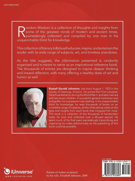 Random Wisdom is a collection of thoughts and insights from some of the greatest minds of modern and ancient times, painstakingly collected and compiled by one man in his unquenchable thirst for knowledge. This collection of literary tidbits will educate, inspire, and entertain the reader with its wide range of subjects, wit, and timeless anecdotes. As the title suggests, the information presented is randomly organized and is meant to serve as an inspirational reference book. The thousands of entries are designed to inspire deeper thinking and inward reflection, with many offering a healthy dose of wit and humor as well.