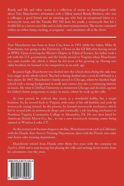Randy and Me and other stories is a collection of stories in chronological order about Tom Manchester's adventures with a fellow named Randy Renfrow, who was a colleague, a good friend, and an amazing guy who had an exceptional talent as a motorcycle racer, and the Yamaha RD 350 from his youth, a motorcycle that led a double life as a serious race bike and as daily street transportation. The stories contained within are either funny, exciting, or poignant - and sometimes all of the above.