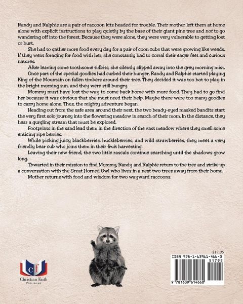 Randy and Ralphie are a pair of raccoon kits headed for trouble. Their mother left them at home alone with explicit instructions to play quietly by the base of their giant pine tree and not to go wandering off into the forest. Because they were alone, they were very vulnerable to getting lost or hurt. She had to gather more food every day for a pair of coon cubs that were growing like weeds. If they went foraging for food with her, she constantly had to corral their eager feet and curious natures. After leaving some toothsome tidbits, she silently slipped away into the grey morning mist. Once part of the special goodies had curbed their hunger, Randy and Ralphie started playing King of the Mountain on fallen timbers around their tree. They decided it was too hot to play in the bright morning sun, and they were still hungry. Mommy must have lost the way to come back home with more food. They had to go find her because it was obvious that she must need their help. Maybe there were too many goodies to carry home alone. Thus, the mighty adventure began. Heading out from the safe area around their nest, the two beady-eyed masked bandits start the very first solo journey into the flowering meadow in search of their mom. In the distance, they hear a gurgling stream that must be explored. Footprints in the sand lead them in the direction of the vast meadow where they smell some enticing ripe berries. While picking juicy blackberries, huckleberries, and wild strawberries, they meet a very friendly bear cub who joins them in their fruit harvesting. Leaving their new friend, the two little rascals continue searching until the shadows grow long. Thwarted in their mission to find Mommy, Randy and Ralphie return to the tree and strike up a conversation with the Great Horned Owl who lives in a nest two trees away from their home. Mother returns with food and wisdom for two wayward raccoons.
