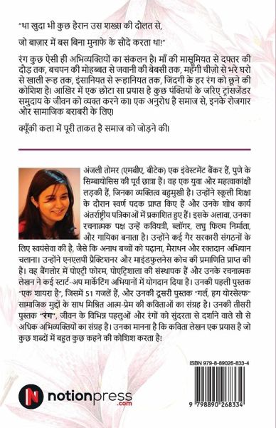 "Even God was somewhat surprised by the wealth of that person, The one who just used to deal in the market without profit!" Rang is a compilation of all such expressions. From mother's innocence to living in the hustle culture, from childhood love to youth's helplessness, from expensive houses to empty soul, from humanity to spirituality, it is an attempt to touch every color of life. At last, there is a small attempt to express the life of transgender community through few lines. There is a request to the society for their employment and social equality.