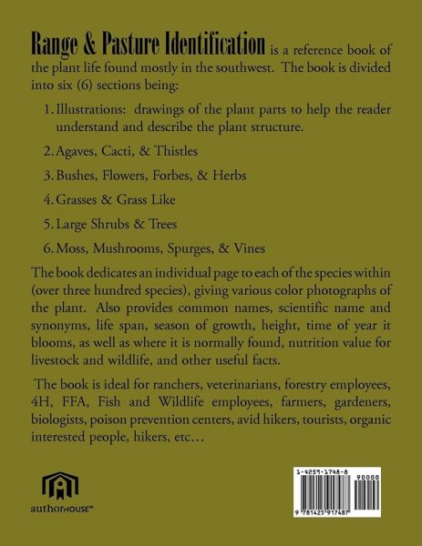 Range & Pasture Identification is a reference book of the plant life found mostly in the southwest. The book is divided into six (6) sections being: Illustrations: drawings of the plant parts to help the reader understand and describe the plant structure. Agaves, Cacti, & Thistles Bushes, Flowers, Forbes, & Herbs Grasses & Grass Like Large Shrubs & Trees Moss, Mushrooms, Spurges, & Vines The book dedicates an individual page to each of the species within (over three hundred species), giving various color photographs of the plant. Also provides common names, scientific name and synonyms, life span, season of growth, height, time of year it blooms, as well as where it is normally found, nutrition value for livestock and wildlife, and other useful facts. The book is ideal for ranchers, veterinarians, forestry employees, 4H, FFA, Fish and Wildlife employees, farmers, gardeners, biologists, poison prevention centers, avid hikers, tourists, organic interested people, hikers, etc.