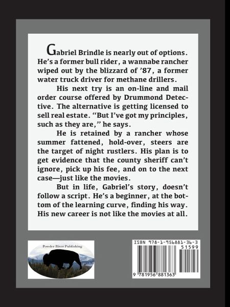 Gabriel Brindle is nearly out of options. He's a former bull rider, a wannabe rancher wiped out by the blizzard of '87, a former water truck driver for methane drillers. His next try is an on-line and mail order course offered by Drummond Detective. The alternative is getting licensed to sell real estate. "But I've got my principles, such as they are," he says. He is retained by a rancher whose summer fattened, hold-over, steers are the target of night rustlers. His plan is to get evidence that the county sheriff can't ignore, pick up his fee, and on to the next case-just like the movies. But in life, Gabriel's story, doesn't follow a script. He's a beginner, at the bottom of the learning curve, finding his way. His new career is not like the movies at all.