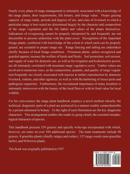 Nearly every phase of range management is intimately associated with a knowledge of the range plants, their requirements, life history, and forage value. Proper grazing capacity of range lands, periods and degrees of use, and class of livestock to which a particular range is best suited are determined largely by the character and composition of the range vegetation and the life habits and values of the plants themselves. Indications of overgrazing cannot be properly interpreted by and frequently are not discernible to persons unfamiliar with the plant cover. Recognition of the important forage plants, combined with knowledge of the extent to which each can be properly grazed, are essential to proper range use. Range fencing and salting are undertaken chiefly because of local forage conditions. Poisonous plants, unless recognized and guarded against, menace the welfare of herds and flocks. Soil protection, soil erosion, and supply of water for domestic use, as well as for irrigation and hydroelectric power, are all intimately correlated with mountain range vegetative cover. Timber values are involved in numerous ways, as the composition, quantity, and quality of range vegetation frequently are closely associated with injuries to timber reproduction by domestic livestock, rodents, and other agencies, as well as with the harboring of insect pests and pathogenic organisms. Furthermore, the recreational importance of many localities is intimately interwoven with the beauty of the local flora or with its food value for local wildlife. For his convenience the range plant handbook employs a novel method whereby the technical, diagnostic parts of a plant are portrayed in a manner readily comprehensible by a person untrained in botany. To the right of each illustration are the key diagnostic characters. This arrangement enables the reader to grasp clearly the essential morphological characters of species. This handbook presents 339 generic and specific write-ups incorporated with which, however, are notes on over 500 additional species. The main treatments include 98 grasses, 8 grasslike plants (chiefly sedges and rushes), 137 range weeds (non-grasslike herbs), and 96 browse plants. This book was originally published in 1937.