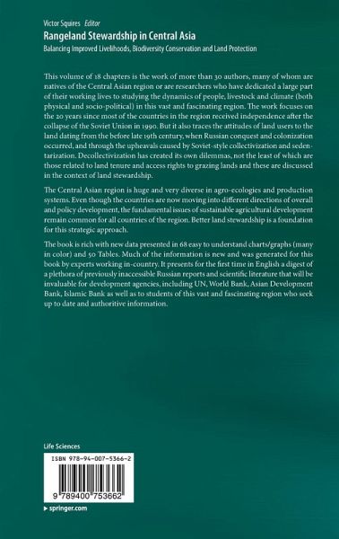 This volume of 18 chapters is the work of more than 30 authors, many of whom are natives of the Central Asian region or are researchers who have dedicated a large part of their working lives to studying the development dynamics in this vast and fascinating region. The work focuses on the 20 years since the collapse of the Soviet Union in 1990. But it also traces the attitudes of land users to the land dating from before the late 19th century, when Russian conquest and colonization occurred, and through the upheavals caused by Soviet-style collectivization and sedentarization. The book is rich with new data presented in 68 easy to understand charts/graphs (many in color) and 50 Tables. Information was generated for this book by experts working in-country. It presents for the first time in English a digest of plethora of previously inaccessible Russian reports and scientific literature that will be invaluable for development agencies, including UN, World Bank, Asian Development Bank, Islamic Bank as well as to students of this vast and fascinating region who seek up to date and authoritive information.