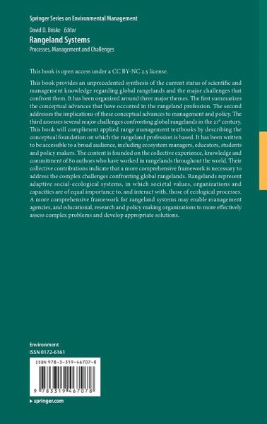 This book provides an unprecedented synthesis of the current status of scientific and management knowledge regarding global rangelands and the major challenges that confront them. It has been organized around three major themes. The first summarizes the conceptual advances that have occurred in the rangeland profession. The second addresses the implications of these conceptual advances to management and policy. The third assesses several major challenges confronting global rangelands in the 21st century. This book will compliment applied range management textbooks by describing the conceptual foundation on which the rangeland profession is based. It has been written to be accessible to a broad audience, including ecosystem managers, educators, students and policy makers. The content is founded on the collective experience, knowledge and commitment of 80 authors who have worked in rangelands throughout the world. Their collective contributions indicate that a more comprehensive framework is necessary to address the complex challenges confronting global rangelands. Rangelands represent adaptive social-ecological systems, in which societal values, organizations and capacities are of equal importance to, and interact with, those of ecological processes. A more comprehensive framework for rangeland systems may enable management agencies, and educational, research and policy making organizations to more effectively assess complex problems and develop appropriate solutions.