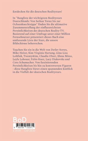 Entdecken Sie die deutschen Realitystars!In "Rangliste der wichtigsten Realitystars Deutschlands: Von Serkan Yavuz bis zur Ochsenknechtsippe" finden Sie die ultimative Zusammenstellung der einflussreichsten Persönlichkeiten des deutschen Reality-TV. Basierend auf einer Umfrage unter einer Million Fernsehnutzer präsentiert dieses Buch eine umfassende Liste der Stars, die unsere Bildschirme beherrschen.Tauchen Sie ein in die Welt von Detlev Steves, Mike Heiter, Kim Virginia Hartung, Gina-Lisa Lohfink, Twenty4tim, Claudia Obert, Elena Miras, Leyla Lahouar, Fabio Knez, Lucy Diakovska und Cora Schumacher. Von faszinierenden Persönlichkeiten bis hin zu kontroversen Figuren - diese Rangliste bietet einen spannenden Einblick in die Vielfalt der deutschen Realitystars.