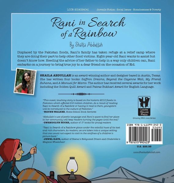 Displaced by the Pakistan floods, Rani's family has taken refuge at a relief camp where they are doing their part to help other flood victims. Eight-year-old Rani wants to assist but doesn't know how. Heeding the advice of her father to help in a way only children can, Rani embarks on a journey to bring true joy to a dear friend on the occasion of Eid. "This sweet, touching story is based on the historic 2010 floods in Pakistan which affected 8.6 million children. As a result of reading Rani in Search of a Rainbow or having it read to them, youngsters will be introduced to the culture of Pakistan." --WAYNE WALKER, Home School Book Reviews "Abdullah's use of poetic language and Rani's quest to find her place in her community will keep readers turning the pages until the end." --GWENDOLYN HOOKS, author of 17 books for young readers "Rani in Search of a Rainbow glows under the colorful hues of its text and rich characters. As readers, we are taken into a unique setting that one would not expect to visit in the confi nes of a children's picture book." --JEWEL KATS, author of Reena's Bollywood Dream and Cinderella's Magical Wheelchair SHAILA ABDULLAH is an award-winning author and designer based in Austin, Texas. Her other books include: Saffron Dreams, Beyond the Cayenne Wall, My Friend Suhana, and A Manual for Marco. The author has received several awards for her work including the Golden Quill Award and Patras Bukhari Award for English Language. For more information please visit www.ShailaAbdullah.com From Growing With Love Series at Loving Healing Press www.LHPress.com LCCN: 2014024041 Juvenile Fiction : Social Issues - Homelessness & Poverty