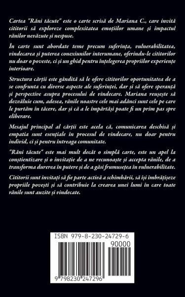 Cartea "R¿ni t¿cute" este o carte scris¿ de Mariana C., care invit¿ cititorii s¿ exploreze complexitatea emöiilor umane ¿i impactul r¿nilor nev¿zute ¿i nespuse. În carte sunt abordate teme precum suferin¿a, vulnerabilitatea, vindecarea ¿i puterea conexiunilor interumane, oferindu-le cititorilor nu doar o poveste, ci ¿i un ghid pentru în¿elegerea propriilor experien¿e interioare. Structura c¿r¿ii este gândit¿ s¿ le ofere cititorilor oportunitatea de a se confrunta cu diverse aspecte ale suferin¿ei, dar ¿i s¿ ofere speran¿¿ ¿i perspective asupra procesului de vindecare. Mariana reüe¿te s¿ dezv¿luie cum, adesea, r¿nile noastre cele mai adânci sunt cele pe care le purt¿m în t¿cere, dar ¿i c¿ a le împ¿rt¿¿i poate fi un prim pas spre eliberare. Mesajul principal al c¿r¿ii este acela c¿, comunicarea deschis¿ ¿i empatia sunt esen¿iale în procesul de vindecare, nu doar pentru individ, ci ¿i pentru întreaga comunitate. "R¿ni t¿cute" este mai mult decât o simpl¿ carte, este un apel la con¿tientizare ¿i o invitäie de a ne recunoäte ¿i accepta r¿nile, de a transforma durerea în putere ¿i de a g¿si frumuse¿ea în vulnerabilitate. Cititorii sunt invitäi s¿ fie parte activ¿ a schimb¿rii, s¿ î¿i îmbr¿¿i¿eze propriile pove¿ti ¿i s¿ contribuie la crearea unei lumi în care toate r¿nile sunt auzite ¿i vindecate.