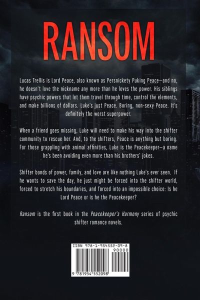Book one in a hot new shifter series will have you falling in love and laughing out loud. Lucas Trellis is Lord Peace, also known as Persnickety Puking Peace-and no, he doesn't love the nickname any more than he loves the power. His siblings have psychic powers that let them travel through time, control the elements, and make billions of dollars. Luke's just Peace. Boring, non-sexy Peace. It's definitely the worst superpower. When a friend goes missing, Luke will need to make his way into the shifter community to rescue her. And, to the shifters, Peace is anything but boring. For those grappling with animal affinities, Luke is the Peacekeeper-a name he's been avoiding even more than his brothers' jokes and his mother's glares. Shifter bonds of power, family, and love are like nothing Luke's ever seen. If he wants to save the day, he just might be forced into the shifter world, forced to stretch his boundaries, and forced into an impossible choice: Is he Lord Peace or is he the Peacekeeper? Ransom is the first book in the Peacekeeper's Harmony series of psychic shifter romance novels.