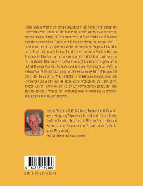 "Meine Seele schwebt in den ewigen Jagdgründen" läßt Schnauzterrier Rantam die Leserschaft wissen. Und es geht ihm bestens im Jenseits, von wo aus er beobachtet, wie sein einstiges Herrchen sich den Kummer von der Seele schreibt. Aus Sicht seines verstorbenen vierbeinigen Freundes erzählt dieser beschwingt aus dessen Leben. Er berichtet von den ersten ungewissen Wochen aus ausgesetzter Welpe in den Straßen der Großstadt und der Aufnahme ins Tierheim, bevor eine nette Familie in Buch am Ammersee bei München ihm ein neues Zuhause gibt. Dort hat Rantam viel Freude in der umgebenden Natur, muss so manche Erziehungstortur über sich ergehen lassen und erlebt einige Abenteuer. Als neues Familienmitglied darf er sogar auf Reisen in verschiedene Länder und nach Ostpreußen, der Heimat seines Herrn, dabei sein und staunt über die Vielfalt der Welt. Eingebettet in die Erlebnisse Rantams, finden sich Erinnerungen und Berichte über die ostpreußische Vergangenheit und Erlebnisse mit anderen Kulturen. Hartmut Gieseler legt ein zum Schmunzeln anregendes, aber auch sehr nachdenklich stimmendes und informatives Werk vor, welches durch zahlreiche Abbildungen und Fotos abgerundet wird.