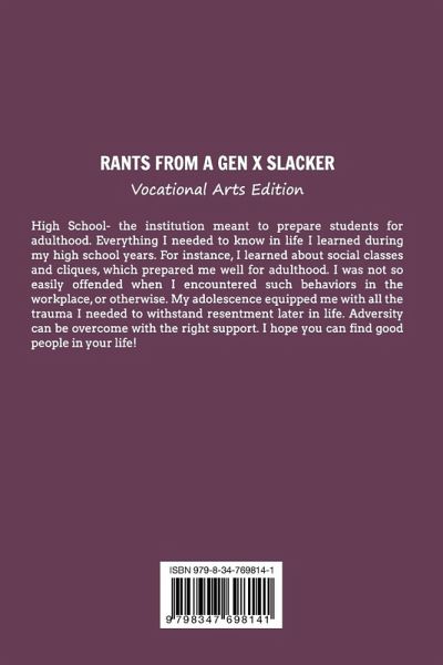 RANTS FROM A GEN X SLACKER Vocational Arts Edition High School- the institution meant to prepare students for adulthood. Everything I needed to know in life I learned during my high school years. For instance, I learned about social classes and cliques, which prepared me well for adulthood. I was not so easily offended when I encountered such behaviors in the workplace, or otherwise. My adolescence equipped me with all the trauma I needed to withstand resentment later in life. Adversity can be overcome with the right support. I hope you can find good people in your life!