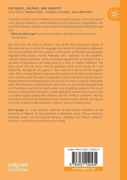Rap Music and the Youth in Malawi is one of the first book-length studies of Malawian hip hop. It studies the language and content of contemporary Malawian hip hop as a window onto the country's youth culture as Malawian young people negotiate what scholar Alcinda Honwana calls 'waithood,' or the condition, common among Malawian youth, of lacking opportunities to advance from a situation of dependence and being stuck in a state of relative childhood. The book argues that rap music made by Malawian youth music speaks of - and represents, through its very agency - their need to break out of this stagnant state. After situating Malawian hip hop with respect to both other musical genres in the country and to the nation's language in culture, Rap Music and the Youth in Malawi shows how Malawian youth use rap music to create a sense of community, which then becomes a foothold from which they can do activities that get them out of waithood and into the adult world, such as getting involved in the music industry, realizing electoral power, or participating in activism about issues such as violence against people with albinism and the COVID-19 pandemic. Hip hop has been a crucial tool for Malawian youth to build the skills, identity, and agency necessary to exercise their economic, cultural, and civic independence.