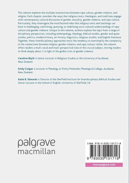 This volume explores the multiple intersections between rape culture, gender violence, and religion. Each chapter considers the ways that religious texts, theologies, and traditions engage with contemporary cultural discourses of gender, sexuality, gender violence, and rape culture. Particularly, they interrogate the multifaceted roles that religious texts and teachings can have in challenging, confirming, querying, or redefining socio-cultural understandings of rape culture and gender violence. Unique to this volume, authors explore the topic from a range of disciplinary perspectives, including anthropology, theology, biblical studies, gender and queer studies, politics, modern history, art history, linguistics, religious studies, and English literature. Together, these interdisciplinary approaches resist the tendency to oversimplify the complexity of the connections between religion, gender violence, and rape culture; rather, the volume offers readers a multi-vocal and multi-perspectival view of this crucial subject, inviting readers to think deeply about it in light of the global crisis of gender violence.