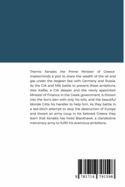 Themis Xenakis the Prime Minister of Greece masterminds a plot to share the wealth of the oil and gas under the Aegean Sea with Germany and Russia. As the CIA and MI6 battle to prevent these ambitions, Alex Kalfas, a CIA sleeper and the newly appointed Minister of Finance in the Greek government, is thrown into the lion's den with only his wits, and the beautiful blonde Gitta his handler to help him. As they battle in a last-ditch attempt to stop the destruction of Europe and thwart an army coup in his beloved Greece they learn that Xenakis has hired Blackhawk, a clandestine mercenary army to fulfil his avaricious ambitions.