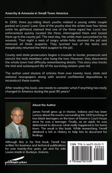 Anarchy & Amnesia in Small Town America In 1930, three joy-riding black youths robbed a young white couple parked on Lover's Lane. One of the youths shot the white man five times while his girl friend claimed that one of the three raped her. Local law enforcement quickly located the three, interrogated them and locked them up in the county jail. The next day, the white man succumbed to his wounds. That night a mob of angry white-folks stormed the jail and removed all three suspects. They lynched two of the teens and inexplicably returned the third suspect to the jail. County and state prosecutors began a crusade to locate, prosecute and convict the mob members who hung the two. However, they discovered the whole town had difficulty remembering details. This story also tracks the trial and subsequent life of the surviving sixteen-year old. The author used dozens of articles from over twenty local, state and national newspapers along with several confidential depositions to reconstruct these events. After reading this book, one needs to consider what if anything has really changed in America during the past 90 years?