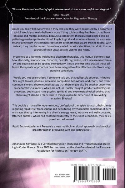 Rapid Entity Attachment Release(REAR) is a radical breakthrough and a multi-dimensional approach in producing swift and lasting relief in psychological and physical problems. This book is a manual for open-minded, professional therapists to assist their clients in gaining rapid relief from serious and debilitating psychosomatic conditions. It demonstrates that by intervening in a client's energy levels, intrusive and well-concealed attached entities, which had contributed directly to the client's condition, may be exposed and addressed. Disorders such as epileptoid seizures, migraine fits, night terrors, phobias, obsessive compulsive behaviours, addictions, and other common ailments may be caused by well-concealed parasitical entities that drain the resources of their unsuspecting victims and hosts. Presented as a lightning insight into alternate therapies, this manual demonstrates how electricity, acupuncture, hypnosis, past-life regression, and spirit release therapy, can be applied interactively.