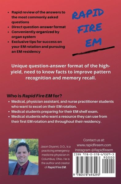 For a sneak peek inside the book, visit rapidfireem.com Check out the E-book on kindle and our Digital App version available on the App store. ¿ Rapid Fire EM: Student Edition is the most innovative and simplified emergency medicine review resource on the market. Designed to deliver the essential facts to help medical, PA, and NP students excel on their EM rotation and score well on their end of rotation clerkship/shelf exam. Bonus material includes: 3rd and 4th year medical school timelines, EM rotation and presentation tips, and information and insight on residency rank lists and interviews. All the facts you need to know that no one talks about! -Let's face it: as a student, you don't have all the time in the world to filter through hundreds of pages of text, long paragraphs, and tedious charts for a one-month rotation. You also don't have time to decipher which facts to commit to memory. -THAT'S WHY RAPID FIRE EM HAS DONE THE WORK FOR YOU! Rapid Fire EM: Student Edition's unique direct question-answer format allows for rapid delivery of the high-yield, need to know facts to improve pattern recognition and memory recall. Rapid Fire EM: Student Edition follows the CDEM core curriculum outlines for medical student emergency medicine rotations. As an added bonus a large amount of the Rapid Fire EM: Student Edition's content is also a review of commonly tested topics seen on step 2 and 3 NBME and NBOME medical school board exams. Rapid Fire EM: Student Edition consists of 27 chapters, 312 pages of information, and over 2900 questions you need to know.