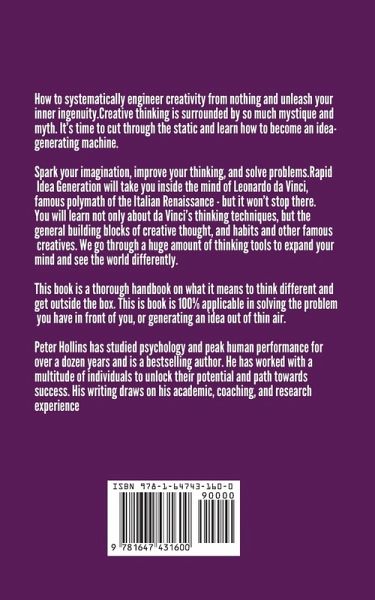 How to systematically engineer creativity from nothing and unleash your inner ingenuity. Creative thinking is surrounded by so much mystique and myth. It's time to cut through the static and learn how to become an idea-generating machine. Spark your imagination, improve your thinking, and solve problems. Rapid Idea Generation will take you inside the mind of Leonardo da Vinci, famous polymath of the Italian Renaissance - but it won't stop there. You will learn not only about da Vinci's thinking techniques, but the general building blocks of creative thought, and habits and other famous creatives. We go through a huge amount of thinking tools to expand your mind and see the world differently. This book is a thorough handbook on what it means to think different and get outside the box. This is book is 100% applicable in solving the problem you have in front of you, or generating an idea out of thin air. Stop relying on inspiration or motivation and make thinking outside the box second nature. Peter Hollins has studied psychology and peak human performance for over a dozen years and is a bestselling author. He has worked with a multitude of individuals to unlock their potential and path towards success. His writing draws on his academic, coaching, and research experience Think like one of history's most famous creatives - and then some. .Learn the biology and psychology of the creative mind. .Building blocks for creativity - from da Vinci and on. .7 techniques to literally thousands of ideas. .Creativity routines and habits of household names. .How to instantly switch to perspectives and angles. Less theory, and more of exactly how to become a prolific creative like the masters. This book is a huge boon for creatives. The ability to generate ideas can be the difference between work and unemployment, and you will gain smart systems to generate thousands. Even if you're not someone who works as a creative, creative thought is one of the most important skills you can ever learn. Life is all about getting from point A to point B, and creative thinking gives you 10X the opportunities. You can solve problems easier and quicker. And besides, a creative life is a fun, fulfilled, and happy life.