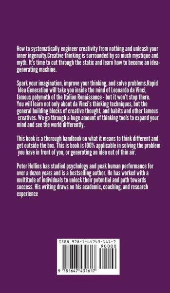 How to systematically engineer creativity from nothing and unleash your inner ingenuity. Creative thinking is surrounded by so much mystique and myth. It's time to cut through the static and learn how to become an idea-generating machine. Spark your imagination, improve your thinking, and solve problems. Rapid Idea Generation will take you inside the mind of Leonardo da Vinci, famous polymath of the Italian Renaissance - but it won't stop there. You will learn not only about da Vinci's thinking techniques, but the general building blocks of creative thought, and habits and other famous creatives. We go through a huge amount of thinking tools to expand your mind and see the world differently. This book is a thorough handbook on what it means to think different and get outside the box. This is book is 100% applicable in solving the problem you have in front of you, or generating an idea out of thin air. Stop relying on inspiration or motivation and make thinking outside the box second nature. Peter Hollins has studied psychology and peak human performance for over a dozen years and is a bestselling author. He has worked with a multitude of individuals to unlock their potential and path towards success. His writing draws on his academic, coaching, and research experience Think like one of history's most famous creatives - and then some. ¿Learn the biology and psychology of the creative mind. ¿Building blocks for creativity - from da Vinci and on. ¿7 techniques to literally thousands of ideas. ¿Creativity routines and habits of household names. ¿How to instantly switch to perspectives and angles. Less theory, and more of exactly how to become a prolific creative like the masters. This book is a huge boon for creatives. The ability to generate ideas can be the difference between work and unemployment, and you will gain smart systems to generate thousands. Even if you're not someone who works as a creative, creative thought is one of the most important skills you can ever learn. Life is all about getting from point A to point B, and creative thinking gives you 10X the opportunities. You can solve problems easier and quicker. And besides, a creative life is a fun, fulfilled, and happy life.