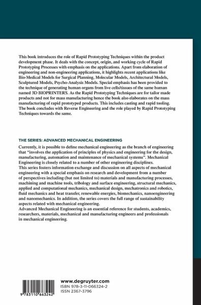 This book introduces the role of Rapid Prototyping Techniques within the product development phase. It deals with the concept, origin, and working cycle of Rapid Prototyping Processes with emphasis on the applications. Apart from elaboration of engineering and non-engineering applications, it highlights recent applications like Bio-Medical Models for Surgical Planning, Molecular Models, Architectural Models, Sculptured Models, Psycho-Analysis Models. Special emphasis has been provided to the technique of generating human organs from live cells/tissues of the same human named 3D BIO PRINTERS. As the Rapid Prototyping Techniques are for tailor made products and not for mass manufacturing hence the book also elaborates on the mass manufacturing of rapid prototyped products. This includes casting and rapid tooling. The book concludes with Reverse Engineering and the role played by Rapid Prototyping Techniques towards the same.