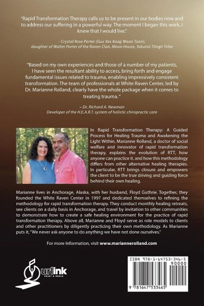 "Rapid Transformation Therapy calls us to be present in our bodies now and to address our suffering in a powerful way. The moment I began this work, I knew that I would live."- Crystal Rose Porter (Gux Xex Kaag Waan Taan), daughter of Walter Porter of the Raven Clan, Moon House, Yakutat Tlingit Tribe"Based on my own experiences and those of a number of my patients, I have seen the resultant ability to access, bring forth and engage fundamental issues related to trauma, enabling impressively consistent transformation. The team of professionals at White Raven Center, led by Dr. Marianne Rolland, clearly have the whole package when it comes to treating trauma. " - Dr. Richard A. Newman Developer of the H.E.A.R.T. system of holistic chiropractic care