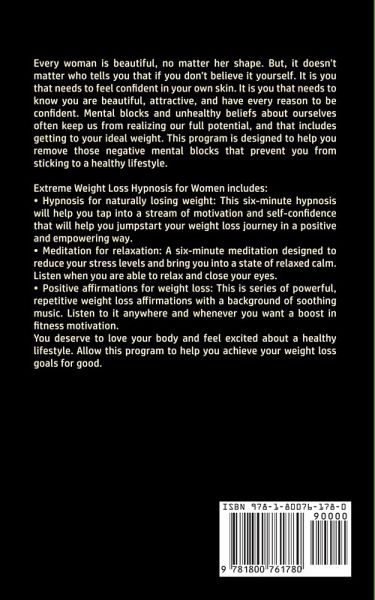 Every woman is beautiful, no matter her shape. But, it doesn't matter who tells you that if you don't believe it yourself. It is you that needs to feel confident in your own skin. It is you that needs to know you are beautiful, attractive, and have every reason to be confident. Mental blocks and unhealthy beliefs about ourselves often keep us from realizing our full potential, and that includes getting to your ideal weight. This program is designed to help you remove those negative mental blocks that prevent you from sticking to a healthy lifestyle. Extreme Weight Loss Hypnosis for Women includes:Hypnosis for naturally losing weight: This six-minute hypnosis will help you tap into a stream of motivation and self-confidence that will help you jumpstart your weight loss journey in a positive and empowering way. Meditation for relaxation: A six-minute meditation designed to reduce your stress levels and bring you into a state of relaxed calm. Listen when you are able to relax and close your eyes. Positive affirmations for weight loss: This is series of powerful, repetitive weight loss affirmations with a background of soothing music. Listen to it anywhere and whenever you want a boost in fitness motivation. You deserve to love your body and feel excited about a healthy lifestyle. Allow this program to help you achieve your weight loss goals for good. So what are you waiting for? Click the "Buy Now" button, and start your weight loss adventure NOW!