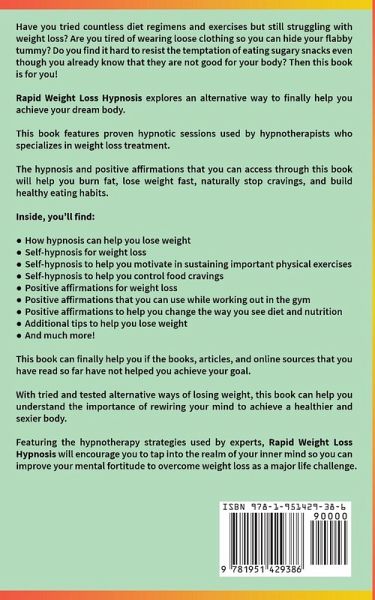 Have you tried countless diet regimens and exercises but still struggling with weight loss? Are you tired of wearing loose clothing so you can hide your flabby tummy? Do you find it hard to resist the temptation of eating sugary snacks even though you already know that they are not good for your body? Then this book is for you! Rapid Weight Loss Hypnosis explores an alternative way to finally help you achieve your dream body. This book features proven hypnotic sessions used by hypnotherapists who specializes in weight loss treatment. The hypnosis and positive affirmations that you can access through this book will help you burn fat, lose weight fast, naturally stop cravings, and build healthy eating habits. Inside, you'll find: ¿ How hypnosis can help you lose weight ¿ Self-hypnosis for weight loss ¿ Self-hypnosis to help you motivate in sustaining important physical exercises ¿ Self-hypnosis to help you control food cravings ¿ Positive affirmations for weight loss ¿ Positive affirmations that you can use while working out in the gym ¿ Positive affirmations to help you change the way you see diet and nutrition ¿ Additional tips to help you lose weight ¿ And much more! This book can finally help you if the books, articles, and online sources that you have read so far have not helped you achieve your goal. With tried and tested alternative ways of losing weight, this book can help you understand the importance of rewiring your mind to achieve a healthier and sexier body. Featuring the hypnotherapy strategies used by experts, Rapid Weight Loss Hypnosis will encourage you to tap into the realm of your inner mind so you can improve your mental fortitude to overcome weight loss as a major life challenge.So, click "Buy Now", crack this book open today, and start exploring hypnotherapy to lose unnecessary weight and finally live your life to the fullest!