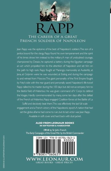 The career of a great French soldier of Napoleon Jean Rapp was the epitome of the best of Napoleon's soldiers. The son of a janitor, bound for the clergy, Rapp found his own temperament and the spirit of his times drove him instead to the military. A man of undoubted courage, championed by Desaix, he captured a battery during the Egyptian campaign-an act which propelled him to the attention of Napoleon and set him on the path to high rank. Rapp fought at Marengo, memorably at Austerlitz, at Jena, at Golymin were he was wounded, at Essling and during the campaign to and retreat from Moscow. This giant personality of the First Empire fought by Ney's side with the rear guard and personally saved Napoleon's life-twice! Rapp rallied to his master during the 100 days but did not accompany him to the fateful field of Waterloo. He was given command of V Corps to defend the Vosges. Hardly commemorated by many, some ten days after the defeat of the French at Waterloo, Rapp engaged Coalition forces at the Battle of La Suffel and decisively beat them. This was effectively the last full scale engagement-and a French victory-of the Napoleonic epoch. A nation that had set the globe aflame had come to ruin, but its last victor was Jean Rapp. Available in soft cover and hard back with dust jacket.