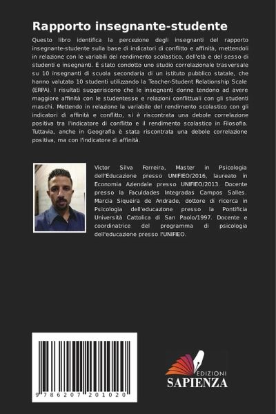 Questo libro identifica la percezione degli insegnanti del rapporto insegnante-studente sulla base di indicatori di conflitto e affinità, mettendoli in relazione con le variabili del rendimento scolastico, dell'età e del sesso di studenti e insegnanti. È stato condotto uno studio correlazionale trasversale su 10 insegnanti di scuola secondaria di un istituto pubblico statale, che hanno valutato 10 studenti utilizzando la Teacher-Student Relationship Scale (ERPA). I risultati suggeriscono che le insegnanti donne tendono ad avere maggiore affinità con le studentesse e relazioni conflittuali con gli studenti maschi. Mettendo in relazione la variabile del rendimento scolastico con gli indicatori di affinità e conflitto, si è riscontrata una debole correlazione positiva tra l'indicatore di conflitto e il rendimento scolastico in Filosofia. Tuttavia, anche in Geografia è stata riscontrata una debole correlazione positiva, ma con l'indicatore di affinità.