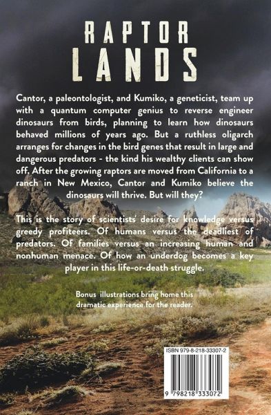 Cantor, a paleontologist, and Kumiko, a geneticist, team up with a quantum computer genius to reverse engineer dinosaurs from birds, planning to learn how dinosaurs behaved millions of years ago. But a ruthless oligarch arranges for changes in the bird genes that result in large and dangerous predators - the kind his wealthy clients can show off. After the growing raptors are moved from California to a ranch in New Mexico, Cantor and Kumiko believe the dinosaurs will thrive. But will they? This is the story of scientists' desire for knowledge versus greedy profiteers. Of humans versus the deadliest of predators. Of families versus an increasing human and nonhuman menace. Of how an underdog becomes a key player in this life-or-death struggle. Bonus illustrations bring home this dramatic experience for the reader.