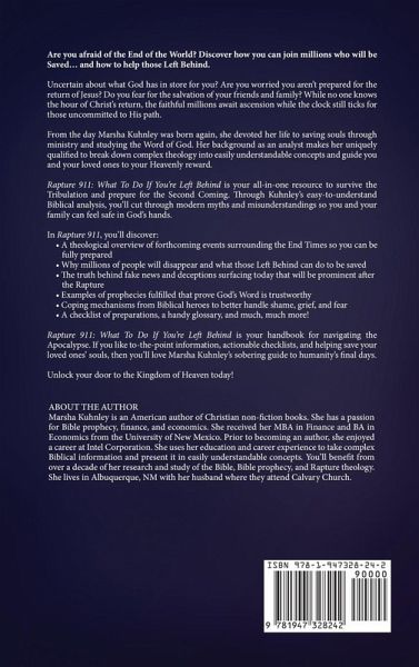 Are you afraid of what's in store for humanity? Think the End of the World is coming? Discover how you can join millions who will be Saved... and how to help those Left Behind. Uncertain about what God has in store for you? Are you worried you aren't prepared for the return of Jesus? Do you fear for the salvation of your friends and family? While no one knows the hour of Christ's return, the faithful millions await the Rapture while the clock still ticks for those uncommitted to His path. Will you be Left Behind to survive the Apocalypse? You can join the millions who will be saved. Do you already believe? Then you can help those who are Left Behind. From the day Marsha Kuhnley was born again, she devoted her life to saving souls through ministry and studying the Word of God. She's been a guest on the popular Christ In Prophecy TV program where she discusses her books and End Times topics. Her background as an analyst makes her uniquely qualified to break down complex theology into easily understandable concepts and guide you and your loved ones to your Heavenly reward. Rapture 911: What To Do If You're Left Behind is your all-in-one resource to survive the Tribulation and prepare for Jesus's Second Coming. Through Kuhnley's easy-to-understand Biblical analysis, you'll cut through modern myths and misunderstandings so you and your family can feel safe in God's hands. In Rapture 911, you'll discover: - Easy-to-understand Biblical analysis. - Theological overview of forthcoming events surrounding the End Times. - Why millions of people will disappear and what those Left Behind can do to be saved. - The truth behind fake news and deceptions surfacing today that will be prominent after the Rapture. - Examples of prophecies fulfilled that prove God's Word is trustworthy. - Coping mechanisms from Biblical heroes to better handle shame, grief, and fear. - A checklist of preparations, a handy glossary, and much, much more! Rapture 911: What To Do If You're Left Behind is your handbook for navigating the Last Days. If you like to-the-point information, actionable checklists, and helping save your loved ones' souls, then you'll love Marsha Kuhnley's sobering guide to humanity's final days. Buy Rapture 911 to unlock your door to the Kingdom of Heaven today!
