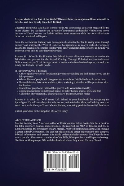 Are you afraid of what's in store for humanity? Think the End of the World is coming? Discover how you can join millions who will be Saved... and how to help those Left Behind. Uncertain about what God has in store for you? Are you worried you aren't prepared for the return of Jesus? Do you fear for the salvation of your friends and family? While no one knows the hour of Christ's return, the faithful millions await the Rapture while the clock still ticks for those uncommitted to His path. Will you be Left Behind to survive the Apocalypse? You can join the millions who will be saved. Do you already believe? Then you can help those who are Left Behind. From the day Marsha Kuhnley was born again, she devoted her life to saving souls through ministry and studying the Word of God. She's been a guest on the popular Christ In Prophecy TV program where she discusses her books and End Times topics. Her background as an analyst makes her uniquely qualified to break down complex theology into easily understandable concepts and guide you and your loved ones to your Heavenly reward. Rapture 911: What To Do If You're Left Behind is your all-in-one resource to survive the Tribulation and prepare for Jesus's Second Coming. Through Kuhnley's easy-to-understand Biblical analysis, you'll cut through modern myths and misunderstandings so you and your family can feel safe in God's hands. In Rapture 911, you'll discover: - Easy-to-understand Biblical analysis. - Theological overview of forthcoming events surrounding the End Times. - Why millions of people will disappear and what those Left Behind can do to be saved. - The truth behind fake news and deceptions surfacing today that will be prominent after the Rapture. - Examples of prophecies fulfilled that prove God's Word is trustworthy. - Coping mechanisms from Biblical heroes to better handle shame, grief, and fear. - A checklist of preparations, a handy glossary, and much, much more! Rapture 911: What To Do If You're Left Behind is your handbook for navigating the Last Days. If you like to-the-point information, actionable checklists, and helping save your loved ones' souls, then you'll love Marsha Kuhnley's sobering guide to humanity's final days. Buy Rapture 911 to unlock your door to the Kingdom of Heaven today!