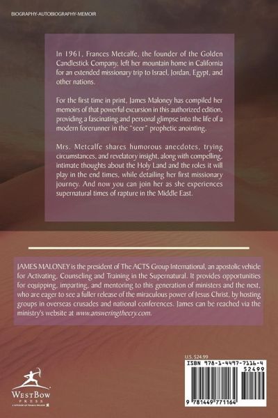 In 1961, Frances Metcalfe, the founder of the Golden Candlestick Company, left her mountain home in California for an extended missionary trip to Israel, Jordan, Egypt, and other nations. For the first time in print, James Maloney has compiled her memoirs of that powerful excursion in this authorized edition, providing a fascinating and personal glimpse into the life of a modern forerunner in the "seer" prophetic anointing. Mrs. Metcalfe shares humorous anecdotes, trying circumstances, and revelatory insight, along with compelling, intimate thoughts about the Holy Land and the roles it will play in the end times, while detailing her first missionary journey. And now you can join her as she experiences supernatural times of rapture in the Middle East.