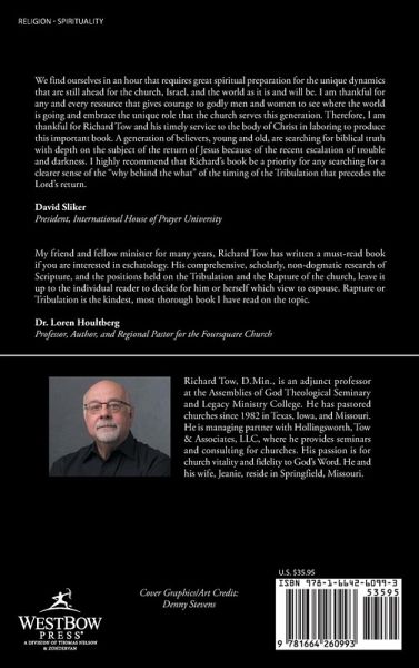 We find ourselves in an hour that requires great spiritual preparation for the unique dynamics that are still ahead for the church, Israel, and the world as it is and will be. I am thankful for any and every resource that gives courage to godly men and women to see where the world is going and embrace the unique role that the church serves this generation. Therefore, I am thankful for Richard Tow and his timely service to the body of Christ in laboring to produce this important book. A generation of believers, young and old, are searching for biblical truth with depth on the subject of the return of Jesus because of the recent escalation of trouble and darkness. I highly recommend that Richard's book be a priority for any searching for a clearer sense of the "why behind the what" of the timing of the Tribulation that precedes the Lord's return. David Sliker President, International House of Prayer University My friend and fellow minister for many years, Richard Tow has written a must-read book if you are interested in eschatology. His comprehensive, scholarly, non-dogmatic research of Scripture, and the positions held on the Tribulation and the Rapture of the church, leave it up to the individual reader to decide for him or herself which view to espouse. Rapture or Tribulation is the kindest, most thorough book I have read on the topic. Dr. Loren Houltberg Professor, Author, and Regional Pastor for the Foursquare Church