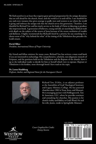 We find ourselves in an hour that requires great spiritual preparation for the unique dynamics that are still ahead for the church, Israel, and the world as it is and will be. I am thankful for any and every resource that gives courage to godly men and women to see where the world is going and embrace the unique role that the church serves this generation. Therefore, I am thankful for Richard Tow and his timely service to the body of Christ in laboring to produce this important book. A generation of believers, young and old, are searching for biblical truth with depth on the subject of the return of Jesus because of the recent escalation of trouble and darkness. I highly recommend that Richard's book be a priority for any searching for a clearer sense of the "why behind the what" of the timing of the Tribulation that precedes the Lord's return. David Sliker President, International House of Prayer University My friend and fellow minister for many years, Richard Tow has written a must-read book if you are interested in eschatology. His comprehensive, scholarly, non-dogmatic research of Scripture, and the positions held on the Tribulation and the Rapture of the church, leave it up to the individual reader to decide for him or herself which view to espouse. Rapture or Tribulation is the kindest, most thorough book I have read on the topic. Dr. Loren Houltberg Professor, Author, and Regional Pastor for the Foursquare Church