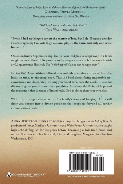 NEW YORK TIMES BESTSELLER • "A masterpiece of hope, love, and the resilience and ferocity of the human spirit."-Glennon Doyle Melton, from the foreword "Profound, tender, honest-and utterly unforgettable."-Gretchen Rubin "I wish I had nothing to say on the matter of loss, but I do. Because one day I encouraged my two kids to go out and play in the rain, and only one came home. . . ." On an ordinary September day, twelve-year-old Jack is swept away in a freak neighborhood flood. His parents and younger sister are left to wrestle with awful questions: How could God let this happen? Can we ever be happy again? In Rare Bird, Anna Whiston-Donaldson unfolds a mother's story of loss that leads, in time, to enduring hope. This is a book about facing impossible circumstances and desperately wishing you could turn back the clock. It is about discovering that you're braver than you think. It is about the flicker of hope and the realization that in times of heartbreak, God is closer than your own skin. With this unforgettable account of a family's love and longing, Anna will draw you deeper into a divine goodness that keeps us-beyond all earthly circumstances-safe.