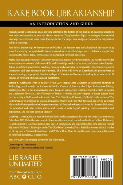 Successfully managing rare book collections requires very specific knowledge and skills. This handbook provides that essential information in a single volume. Rare Book Librarianship for the 21st Century is the first new rare books handbook of practice in 25 years. Authored by two special collections experts with extensive field experience, this book is also the first to discuss the role of digital technologies in managing a rare book collection. After a fascinating discussion of the history and current state of rare book libraries, this handbook provides a comprehensive account of the core skills and knowledge needed to be a successful rare book librarian. Topics include best practices for handling, housing, and conserving rare materials; collection development techniques; and user education and outreach. This book will serve as a handbook for practitioners in academic settings, large public libraries, and special libraries, and as a textbook for students in MLIS courses on rare book librarianship and curatorship.