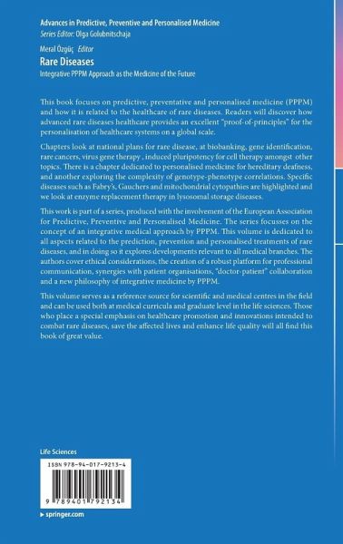 This book focuses on predictive, preventative and personalized medicine (PPPM) and how it is related to the healthcare of rare diseases. Readers will discover how advanced rare diseases healthcare provides an excellent "proof-of-principles" for the personalisation of healthcare systems on a global scale. Chapters look at national plans for rare disease, at biobanking, gene identification, rare cancers, virus gene therapy , induced pluripotency for cell therapy amongst other topics. There is a chapter dedicated to personalized medicine for hereditary deafness and another exploring the complexity of genotype-phenotype correlations. Specific diseases such as Fabry's, Gauchers and mitochondrial cytopathies are highlighted and we look at enzyme replacement therapy in lysosomal storage diseases. This work is part of a series, produced with the involvement of the European Association for Predictive, Preventive and Personalised Medicine. The series focusses on the concept of an integrative medical approach by PPPM. This volume is dedicated to all aspects related to the prediction, prevention and personalised treatments of rare diseases, and in doing so it explores developments relevant to all medical branches. The authors cover ethical considerations, the creation of a robust platform for professional communication, synergies with patient organisations, "doctor-patient" collaboration and a new philosophy of integrative medicine by PPPM. This volume serves as a reference source for scientific and medical centres in the field and can be used both at medical curricula and graduate level in the life sciences. Those who place a special emphasis on healthcare promotion and innovations intended to combat rare diseases, save the affected lives and enhance life quality will all find this book of great value.