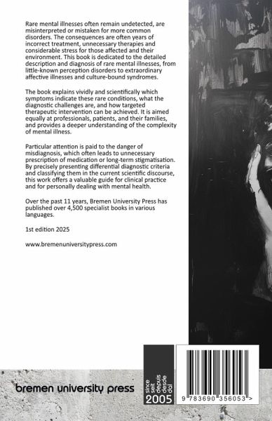Rare mental illnesses often remain undetected, are misinterpreted or mistaken for more common disorders. The consequences are often years of incorrect treatment, unnecessary therapies and considerable stress for those affected and their environment. This book is dedicated to the detailed description and diagnosis of rare mental illnesses, from little-known perception disorders to extraordinary affective illnesses and culture-bound syndromes. The book explains vividly and scientifically which symptoms indicate these rare conditions, what the diagnostic challenges are, and how targeted therapeutic intervention can be achieved. It is aimed equally at professionals, patients, and their families, and provides a deeper understanding of the complexity of mental illness. Particular attention is paid to the danger of misdiagnosis, which often leads to unnecessary prescription of medication or long-term stigmatisation. By precisely presenting differential diagnostic criteria and classifying them in the current scientific discourse, this work offers a valuable guide for clinical practice and for personally dealing with mental health. Over the past 11 years, Bremen University Press has published over 4,500 specialist books in various languages.